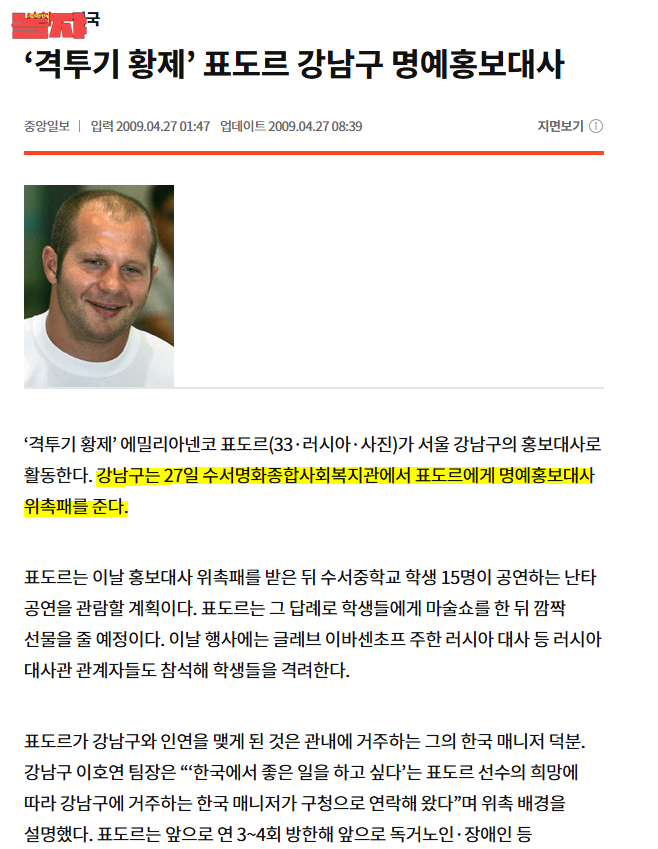 웃긴건 그렇게 크고 격투기의 황제로 불리는 사람이 경호원 3-4명을 데리고 왔는데 경호원도 밀리지 않는 덩치였음