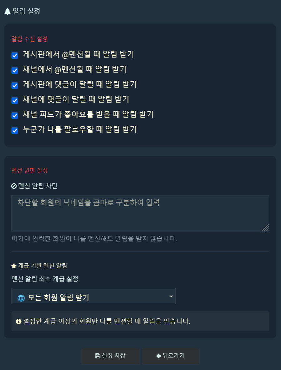 멘션 및 알림 설정 기능 추가 놀쟈 0 2331 9 2025.09.18 21:54 안녕하세요, 운영팀입니다.사이트에 @멘션 기능을 추가하였습니다.@닉네임 형식으로 특정 회원을 게시판에서 언급할 경우 해당 회원에게 알림이 발송됩니다.멘션 알림은 회원메뉴 > 알림 > '알림설정'에서 상세 설정 가능합니다.감사합니다. 9 이 공지를 9명의 회원이 좋아합니다 웍스 CoName ㄴㅌㅁㅁㅇㄹ 골든아워 노잼CiTY 노트르담드파리 qwerzxc 진저 작성자 인증 놀쟈 하사 5호봉 헌병대장 68% 팔로워 106 포인트 148,495 소개 글이 없습니다. 채널 팔로우 채널 최신글 채널에 댓글 페이징 기능이 추가되었습니다. 상세 설정은 채널 기본설정 페이지에서 가능합니다. 감사합니다. 12-19 0 1 채널 검색 기능 버그 수정 완료되었습니다. 감사합니다. 12-12 0 8 채널 검색 기능 버그 인지하고 있습니다. 수정 기다려 주세요. 12-12 0 13 채널 업데이트 안내합니다. - 이미지 상세보기 돋보기 아이콘 +,- 구분 - 추천순 정렬 알고리즘 변경. 감사합니다. 11-18 0 2 채널 기능 업데이트 안내합니다. - 태그 등록 버그 수정 - 영상 파일 1개만 등록된 피드에서 첨부된 영상이 자동 삭제되는 버그 수정 미디어 파일 자동 삭제로 이용에 불편끼친 점 회원님들께 사과드립니다. 감사합니다. 11-03 0 2 성인게시판 최신글 성인 게시판 이용 규칙 안내 12-13 0 4935